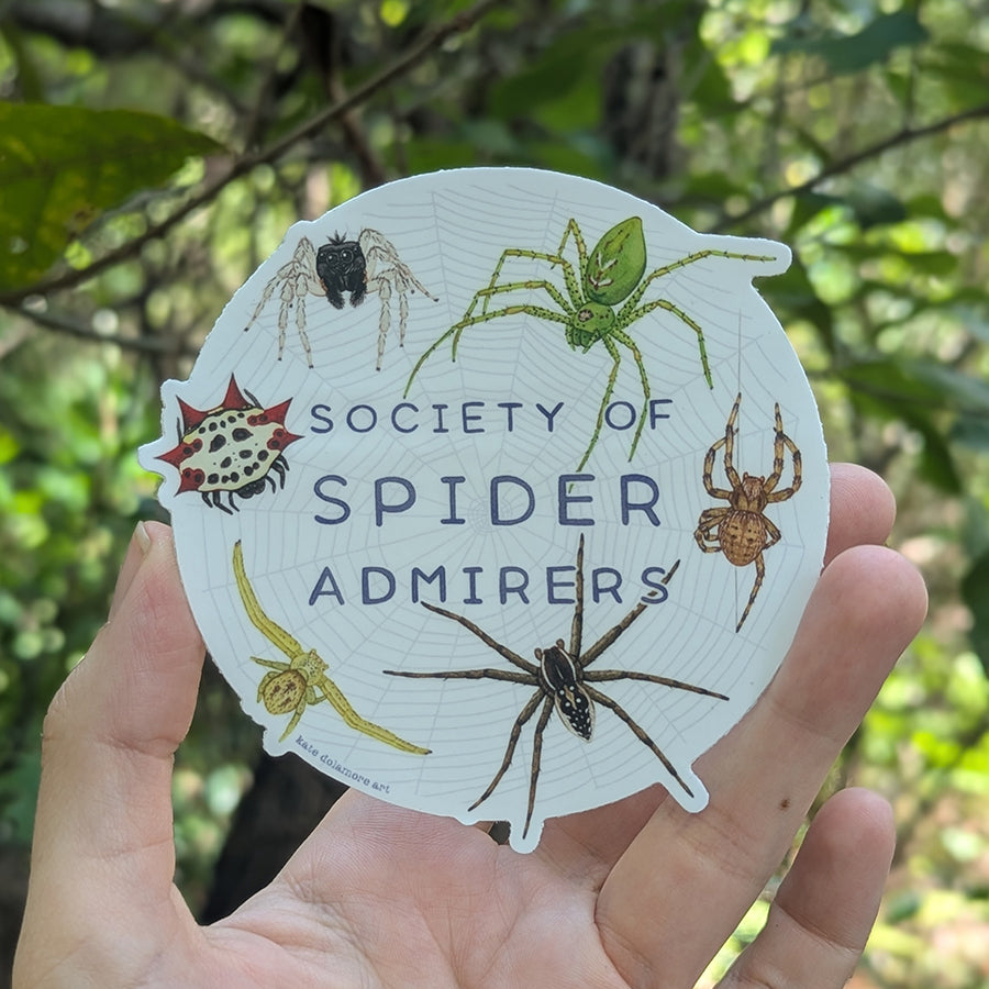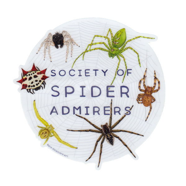 This sticker features a selection of spiders and reads "Society of Spider Admirers". Spiders included are Dimorphic Jumping Spider, Green Lynx Spider, Spotted Orbweaver, Six Spotted Fishing Spider, Crab Spider, and Spiny Backed Orbweaver.