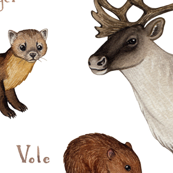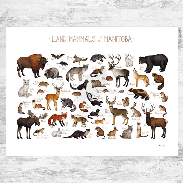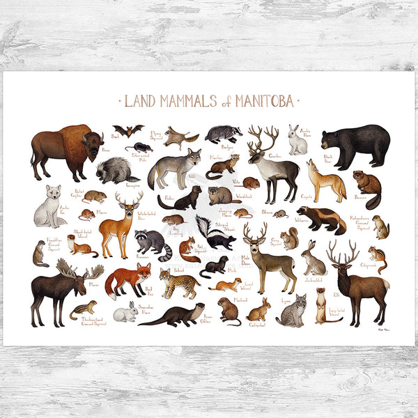 This print of a watercolor painting features the Mammals of Manitoba as a field guide chart. It features the following animals: