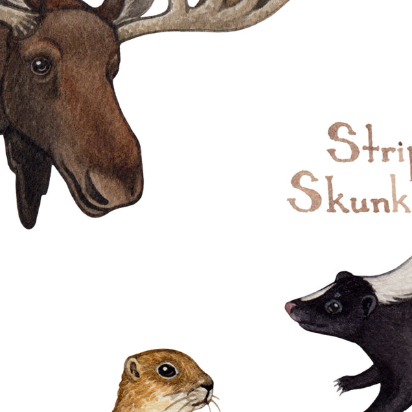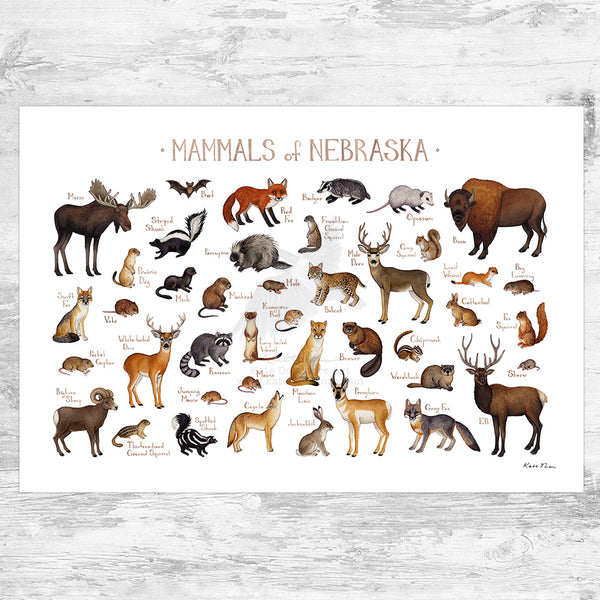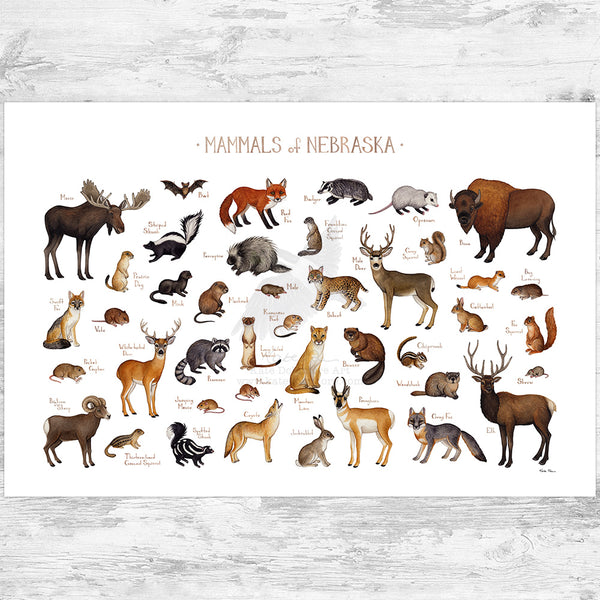 This print of a watercolor painting features the Mammals of Nebraska as a field guide chart. It features the following animals: