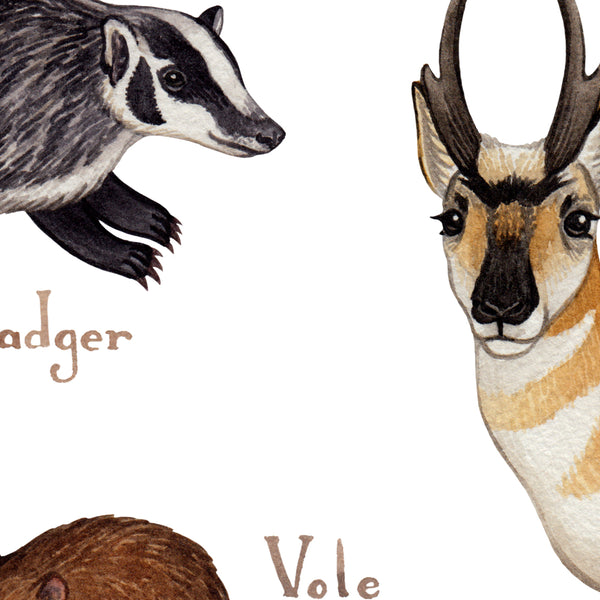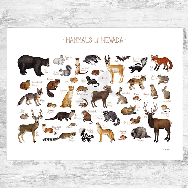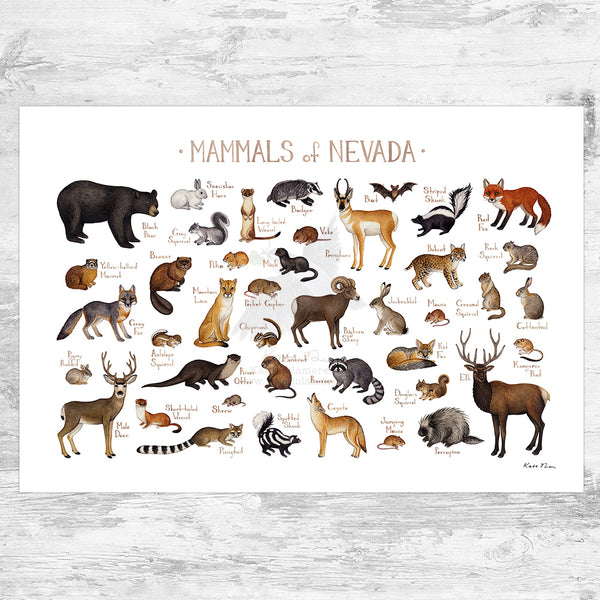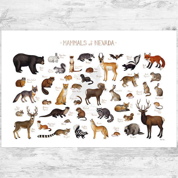 This print of a watercolor painting features the Mammals of Nevada as a field guide chart. It features the following animals: