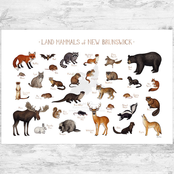 This print of a watercolor painting features the Land Mammals of New Brunswick as a field guide chart. It features the following animals: