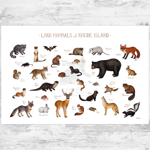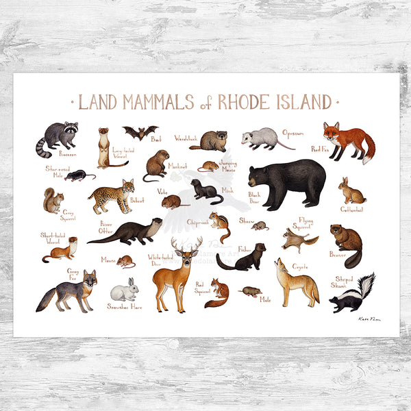 This print of a watercolor painting features the Land Mammals of Rhode Island as a field guide chart. It features the following animals: