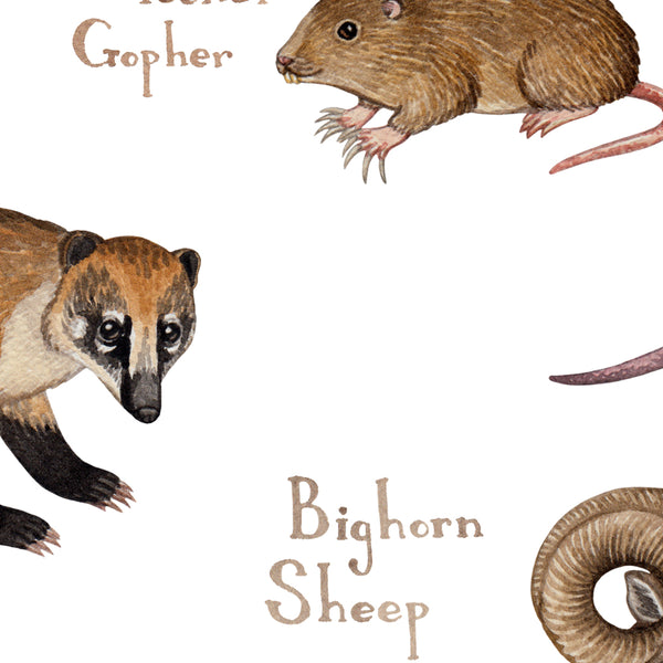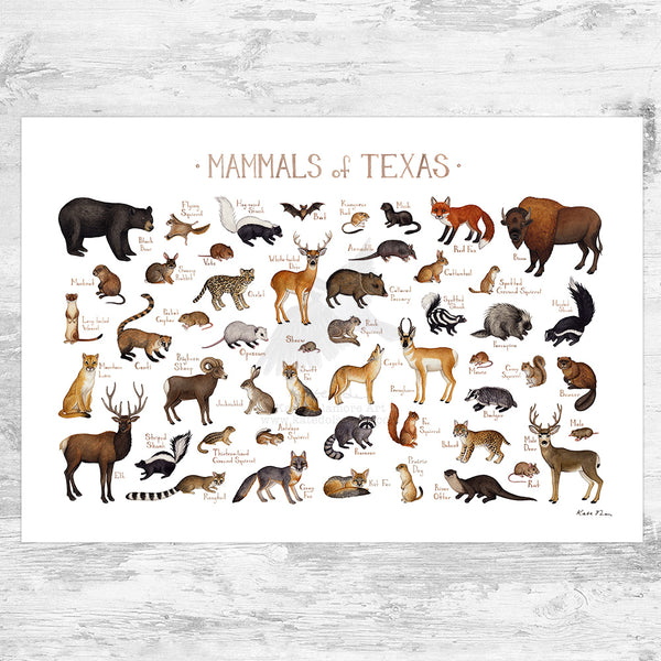 This print of a watercolor painting features the Land Mammals of Texas as a field guide chart. It features the following animals: