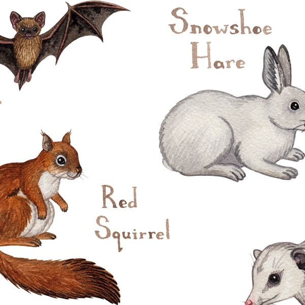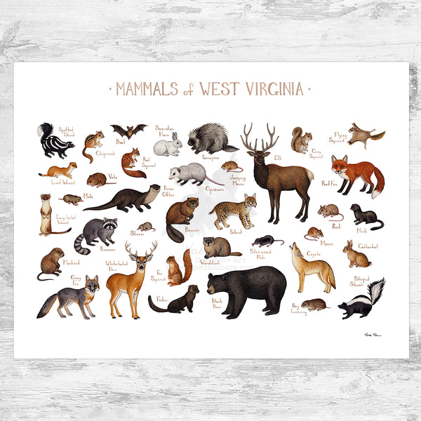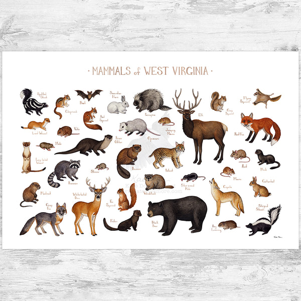 This print of a watercolor painting features the Mammals of West Virginia as a field guide chart. It features the following animals: