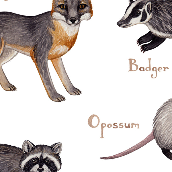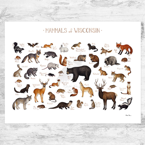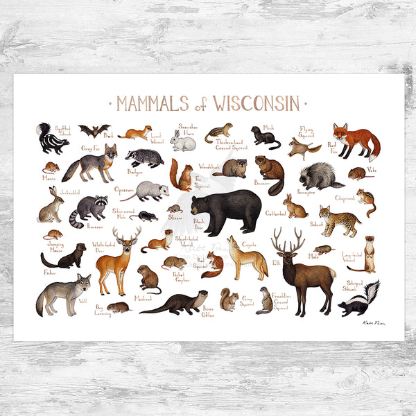 This print of a watercolor painting features the Mammals of Wisconsin as a field guide chart. It features the following animals: