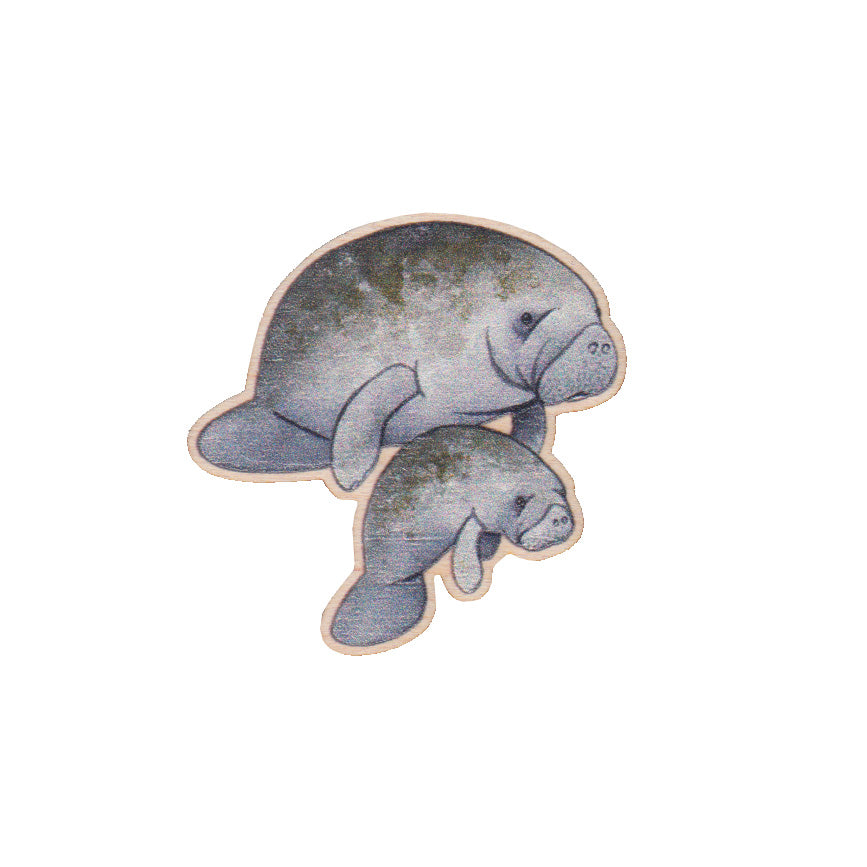 This wooden pin features a Manatee mama and baby.