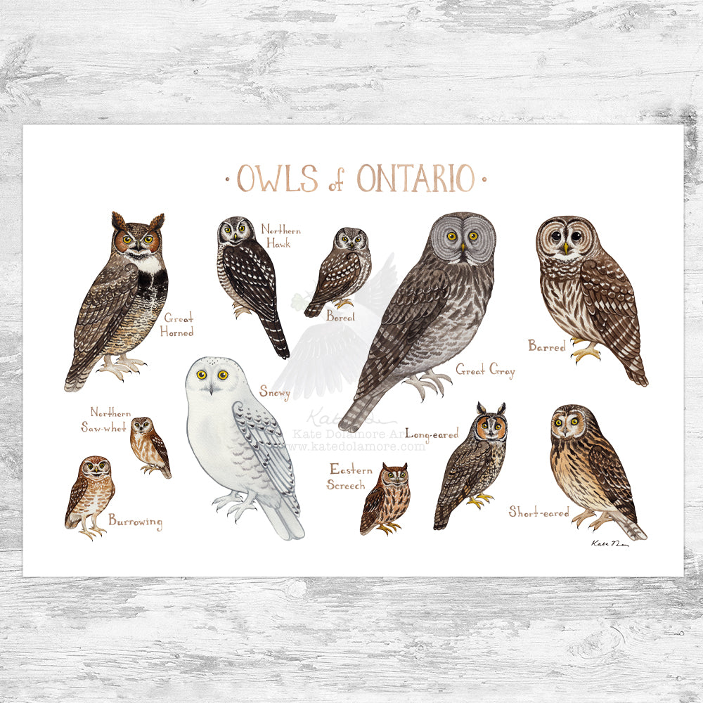 This watercolor painting features the owls of Ontario, Canada as a field guide chart. It features the following owls: