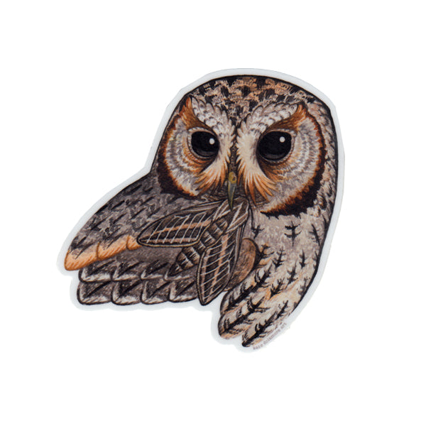 This sticker features a Flammulated Owl with White-lined Sphinx Moth.