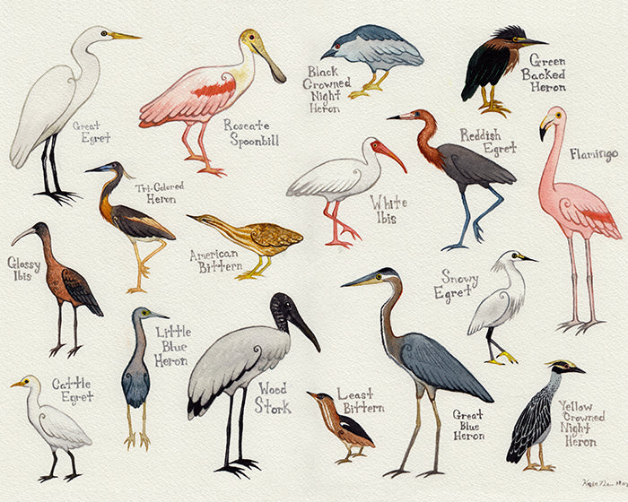 I started painting the field guide style pieces in order to learn to better identify birds. I painted all the birds that were on the Merritt Island NWR bird list at that time. The first one was wading birds!