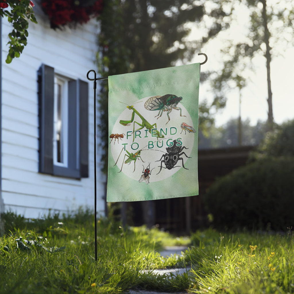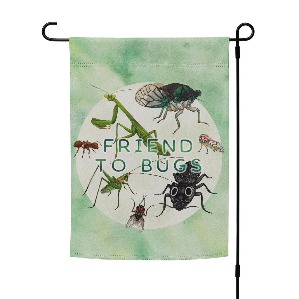 This garden flag is made out of weather-resistant 100% polyester and measures approximately 12x17 inches. It reads "Friend to Bugs" and features a Praying Mantis, Cicada, Planthopper, Click Beetle, Fly, Katydid, and Ant.