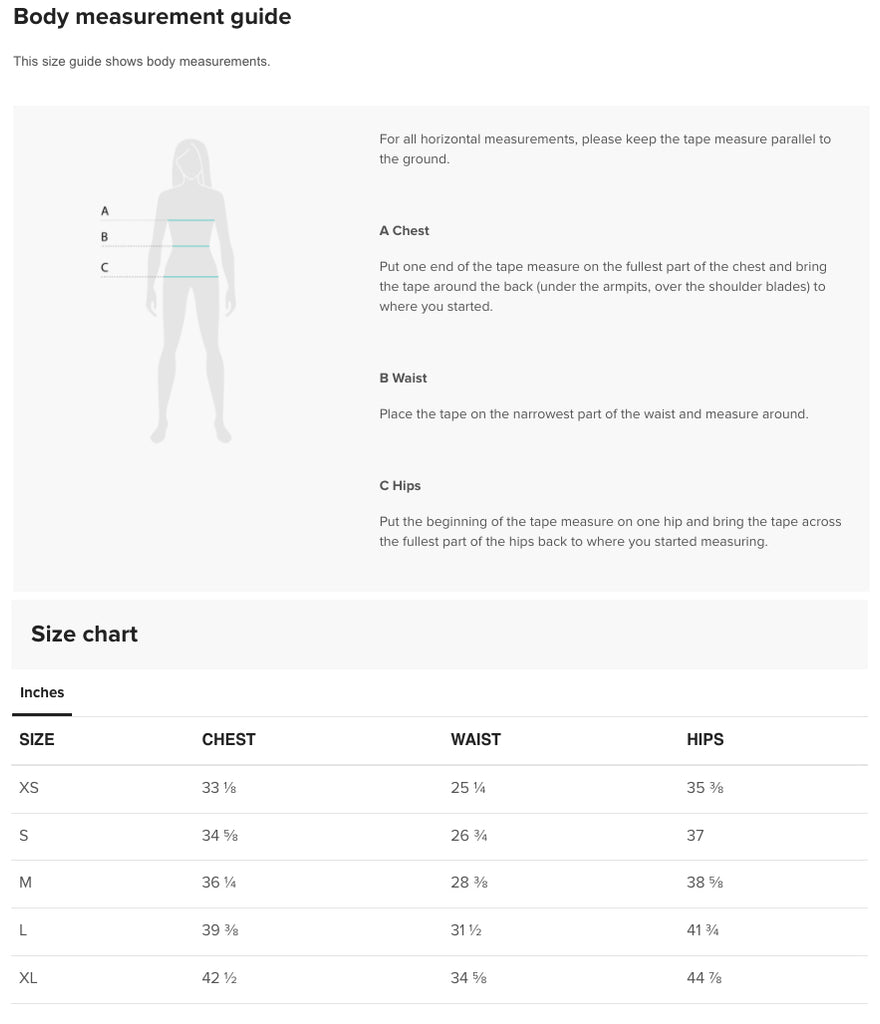 XS (inches) | 25 ¼ | 35 ⅜ |